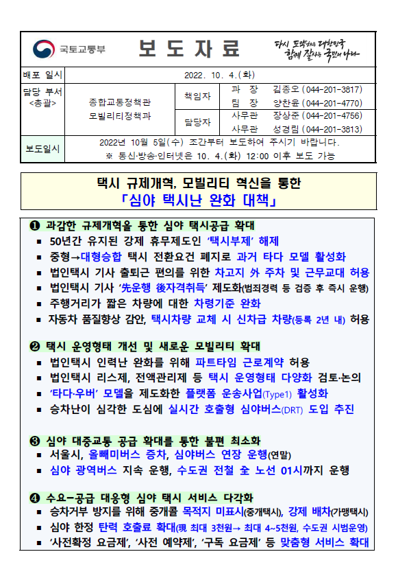 [국토부 보도자료] 심야 택시난 완화 대책
