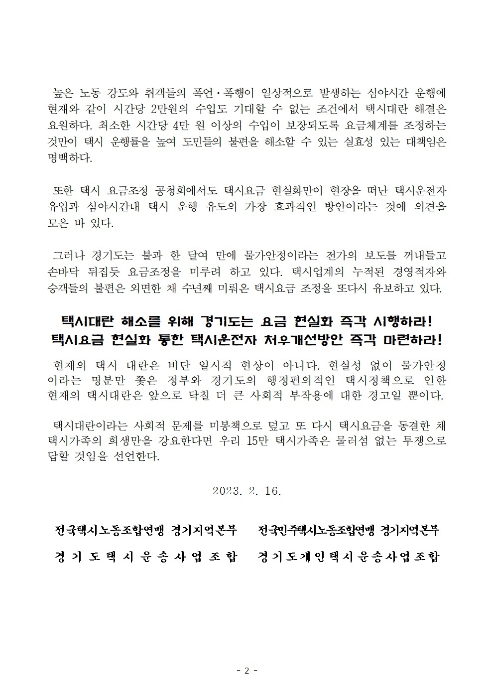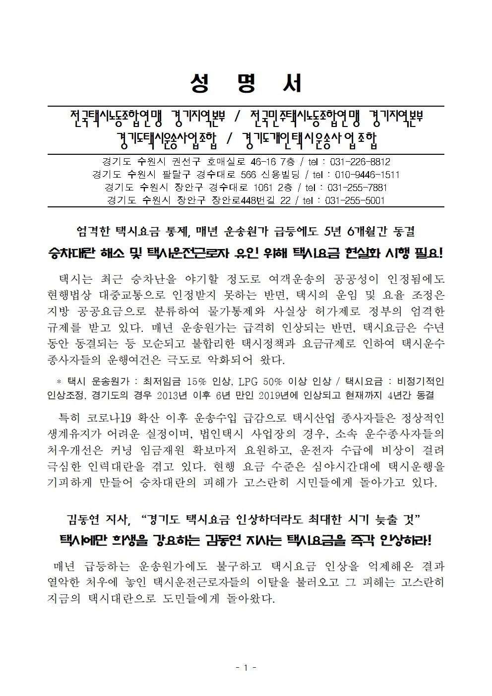 택시요금인상 관련 성명서