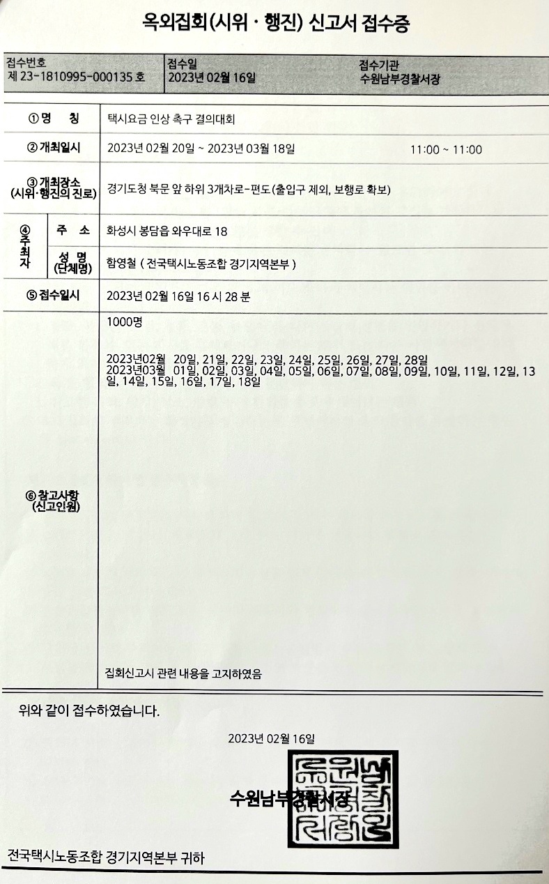 집회신고서(택시요금 인상 촉구 결의대회)