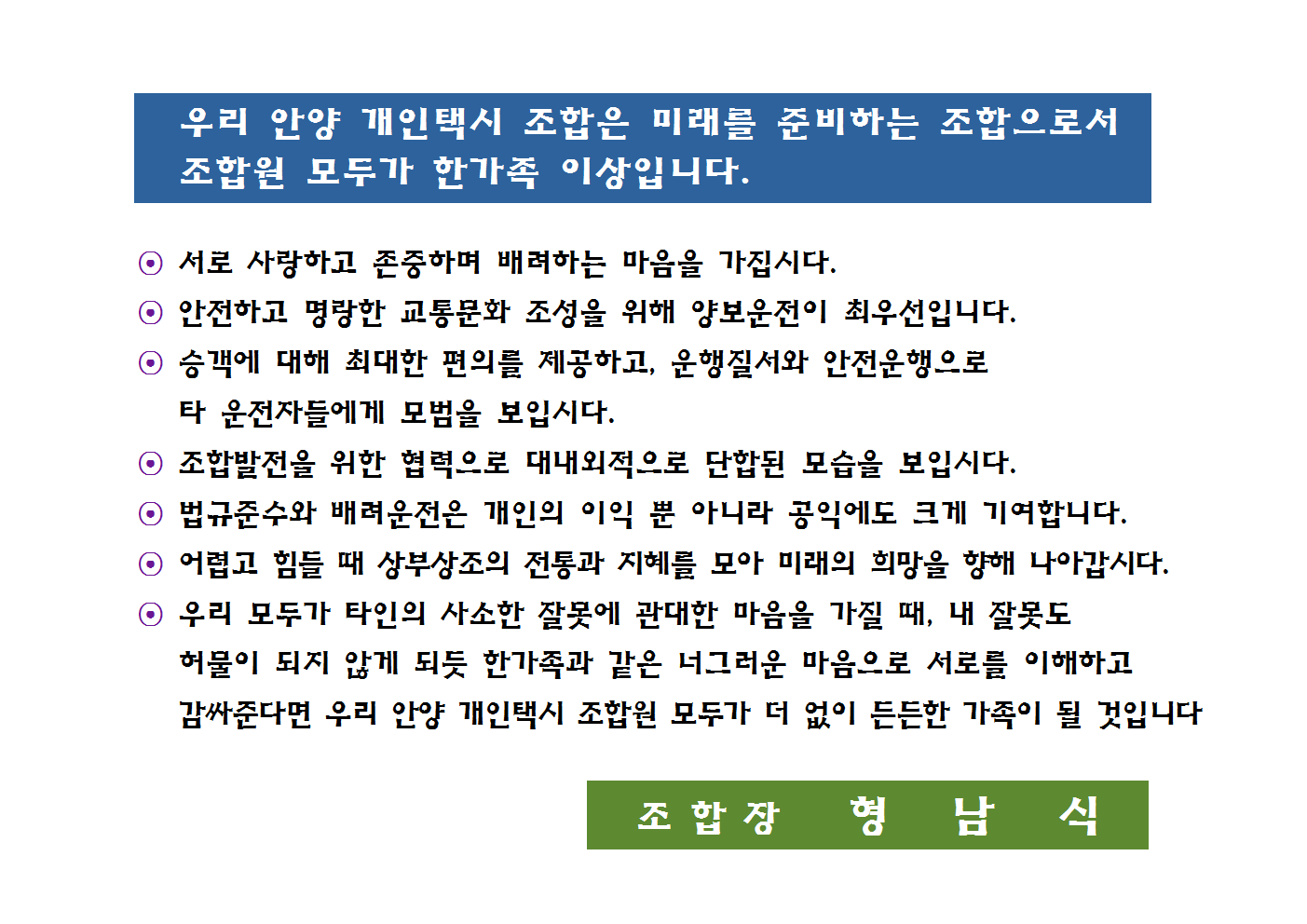 우리 안양개인택시 조합원 모두는 한가족 이상입니다.