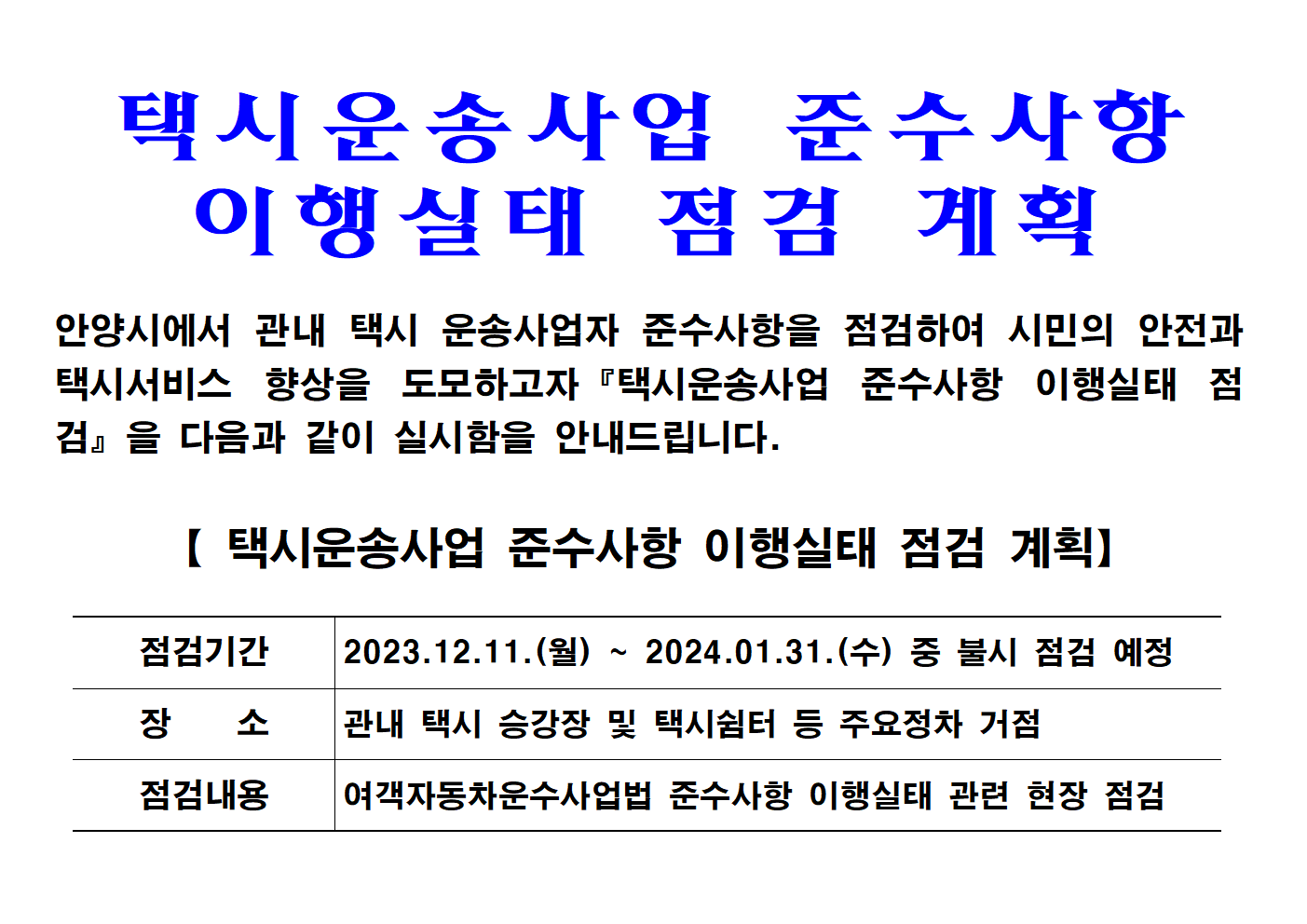 택시운송사업 준수사항 이행실태 점검 계획