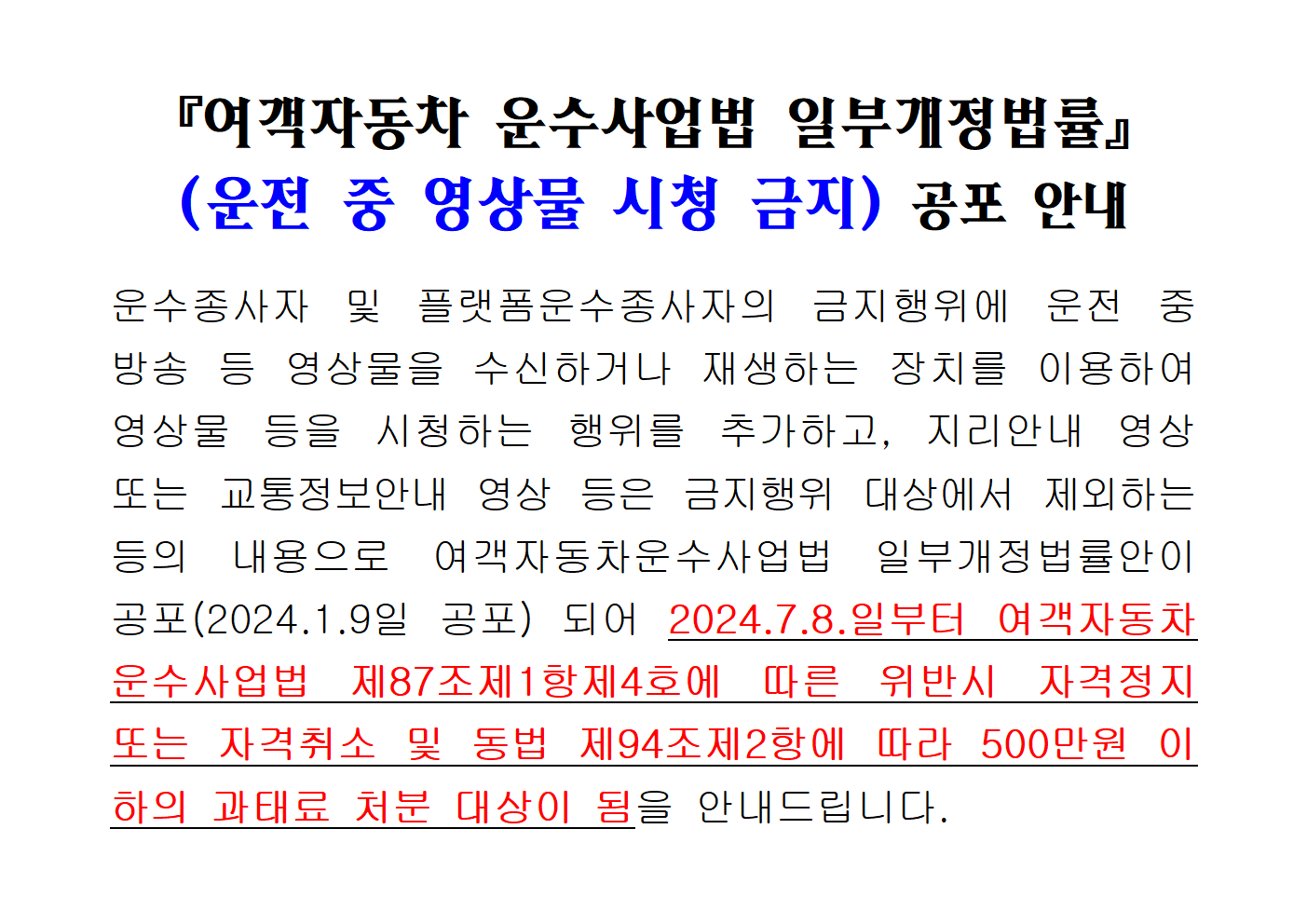 운전 중 영상물 시청 금지(여객자동차운수사업법 일부개정법률) 공포 안내