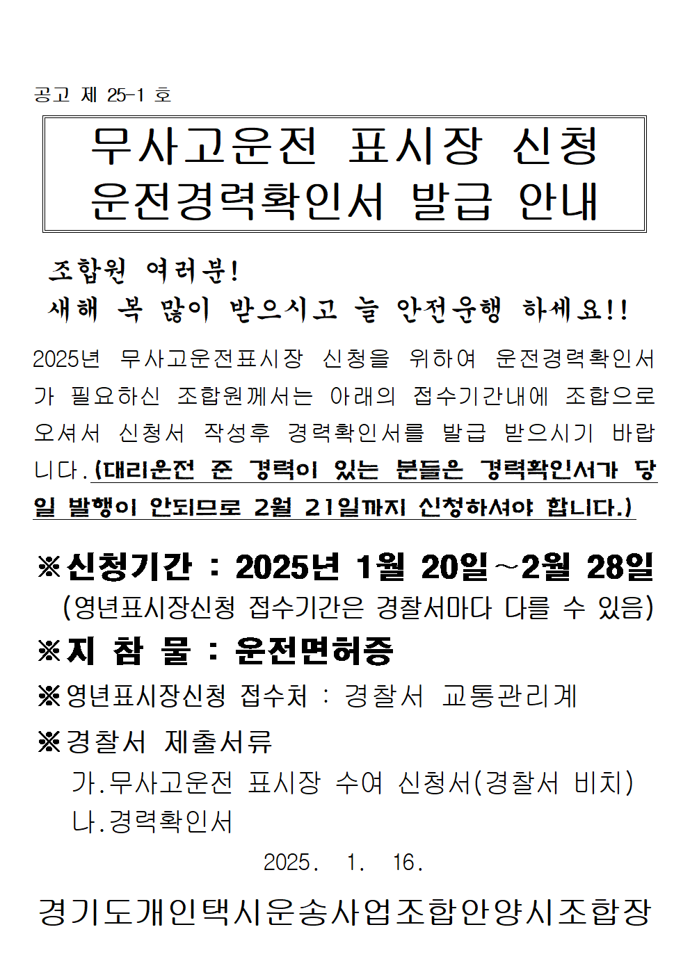 무사고운전 표시장 신청 운전경력확인서 발급 안내
