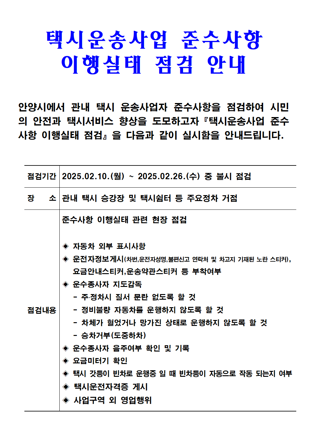 택시운송사업 준수사항 이행실태 점검 안내