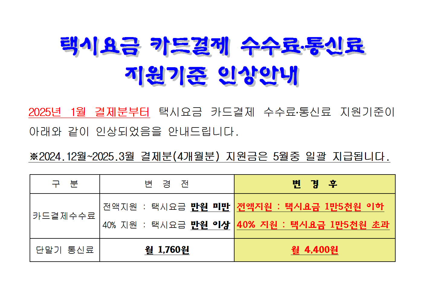 카드결제 수수료,통신료 지원기준 인상안내