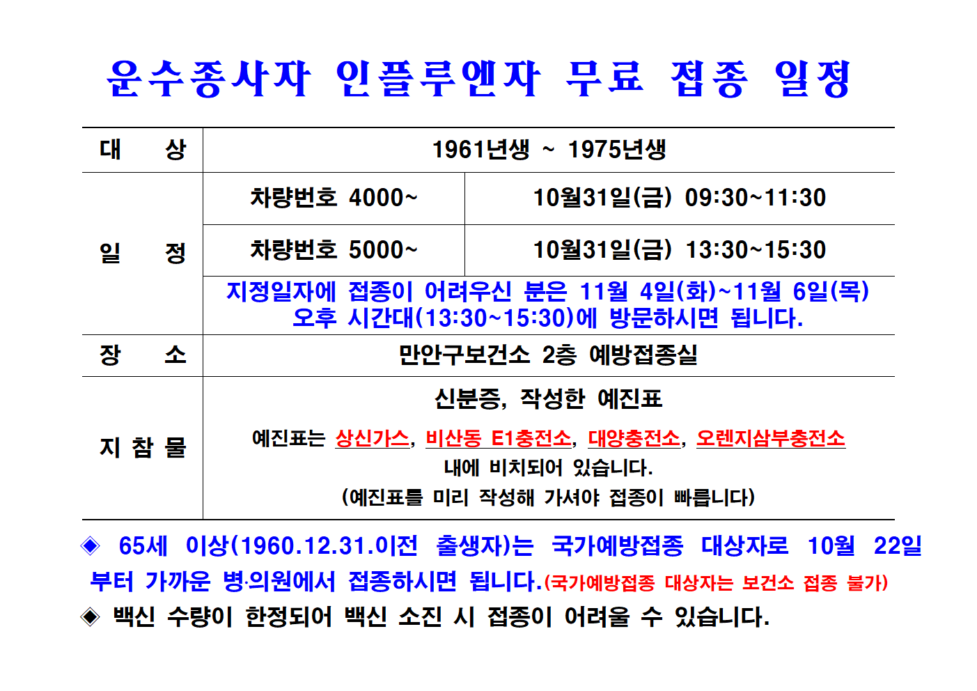 운수종사자 인플루엔자 무료 접종 일정