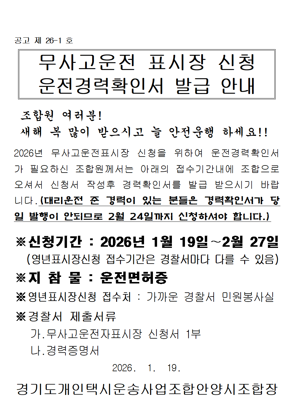무사고운전 표시장 신청 운전경력확인서 발급 안내
