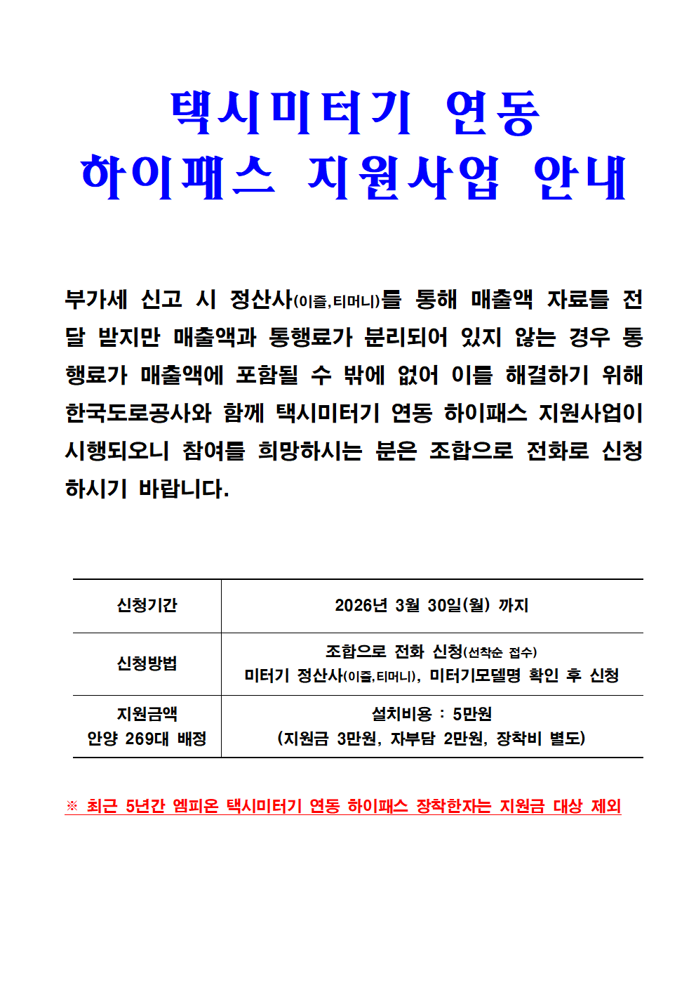 택시미터기 연동 하이패스 지원사업 안내